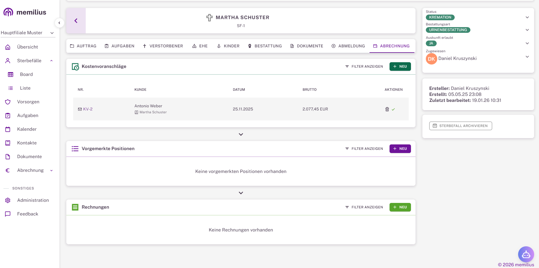 Das Dashboard der Bestattersoftware  memilius