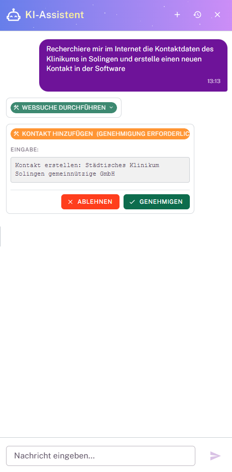 Mit dem KI-Assistenten recherchiert memilius automatisch Kontaktdaten und bereitet neue Einträge zur Genehmigung vor.