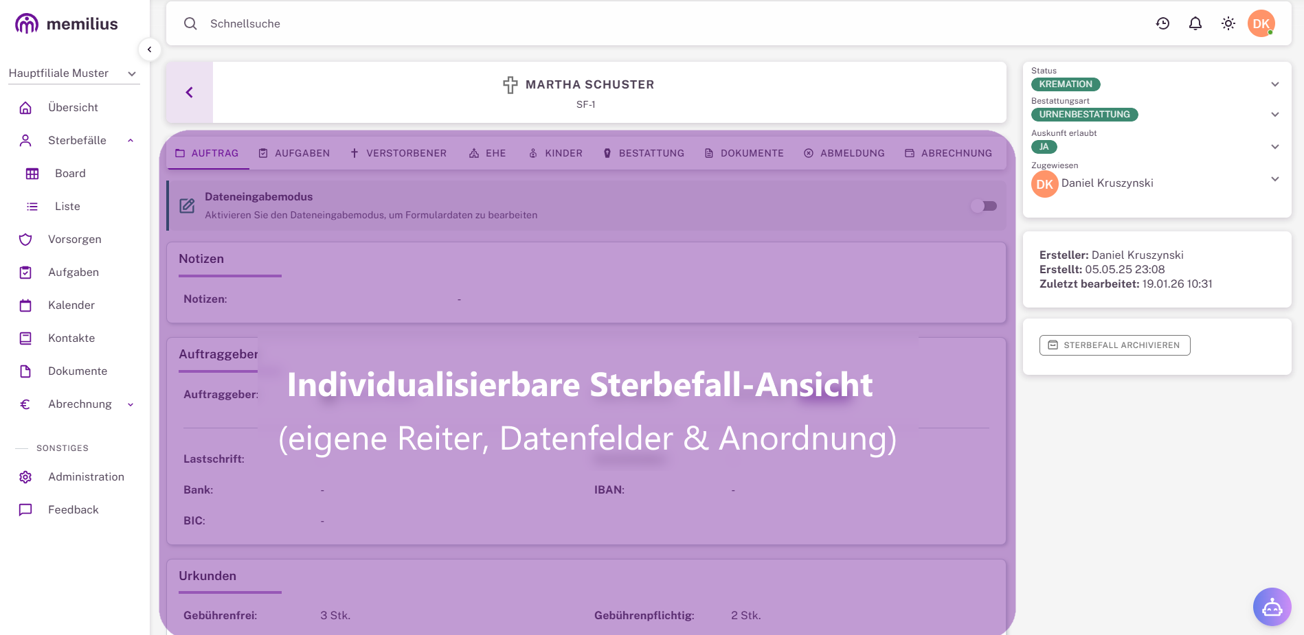 Individualisierbare Sterbefall-Ansicht: Eigene Reiter, Datenfelder und Anordnung – exakt angepasst an Ihre Arbeitsweise.